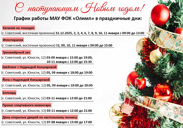 Тренажёрный зал (г. Советский, ул. Юности, 12) 03-09 января с 15:00 до 19:00; 10-11 января с 12:00 до 15:30