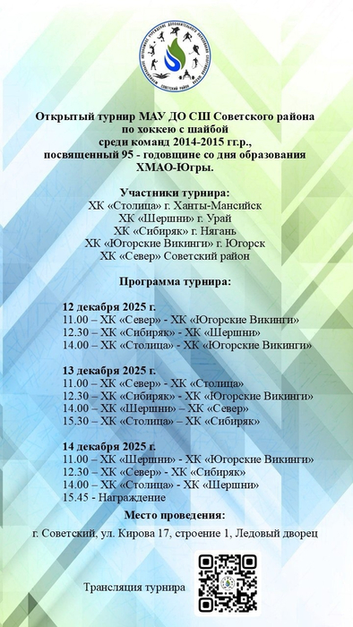 12 декабря 2025 года в здании Ледовый Дворец пройдет Открытый турнир МАУ ДО СШ Советского района по хоккею с шайбой среди команд 2014-2015 гг.р., посвященный 95-летию со дня образования Ханты-Мансийского автономного округа -Югры.